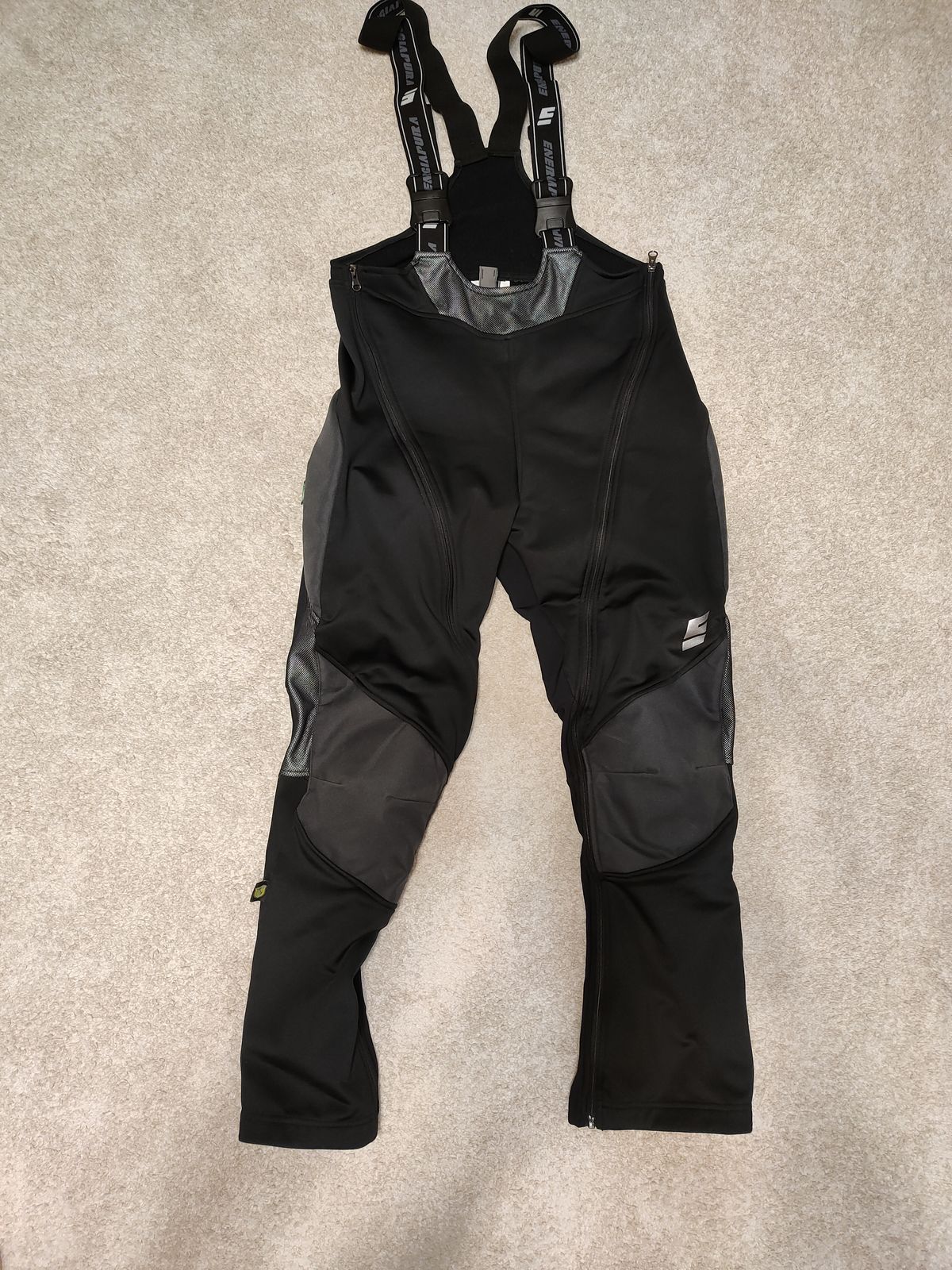 Тренировочные горнолыжные брюки-самосбросы "Softshell" с полной застежкой-молнией. Модель Energiapura Valloire Full SR. Размер L (48-50), цвет черно-серый . Имеют вшитую защиту бедер и съемную защиту колен. Внутренняя сторона - типа флис. Брюки новые, но этикетка к сожалению утеряна. Торг уместен.