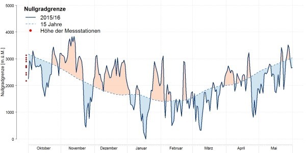 Ниже приведен обзор показателей точки замерзания (темно-синим цветом). Для сравнения приведен средний показатель точки замерзания за прошедшие 15 лет (пунктирной голубой линией). Показатель вычислялся согласно данным 11 автоматических станций SLF и MeteoSwiss, учитывая градиент 0.6 ° C / 100 м. Красные точки указывают высоту нахождения метеостанций.