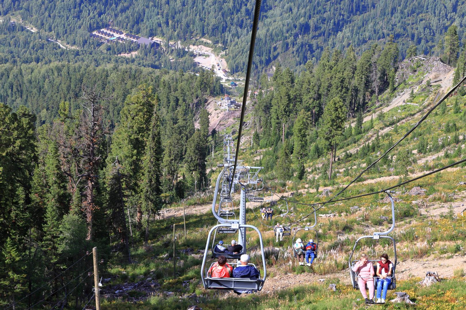 Гора Кокуя (1386м) и её подножие – очень красивое место. С верху обалденные виды, в том числе и на Телецкое озеро. Но двухместный подъёмник очень древний – родом из середины 20 века. Время подъёма на вершину около 25 минут.