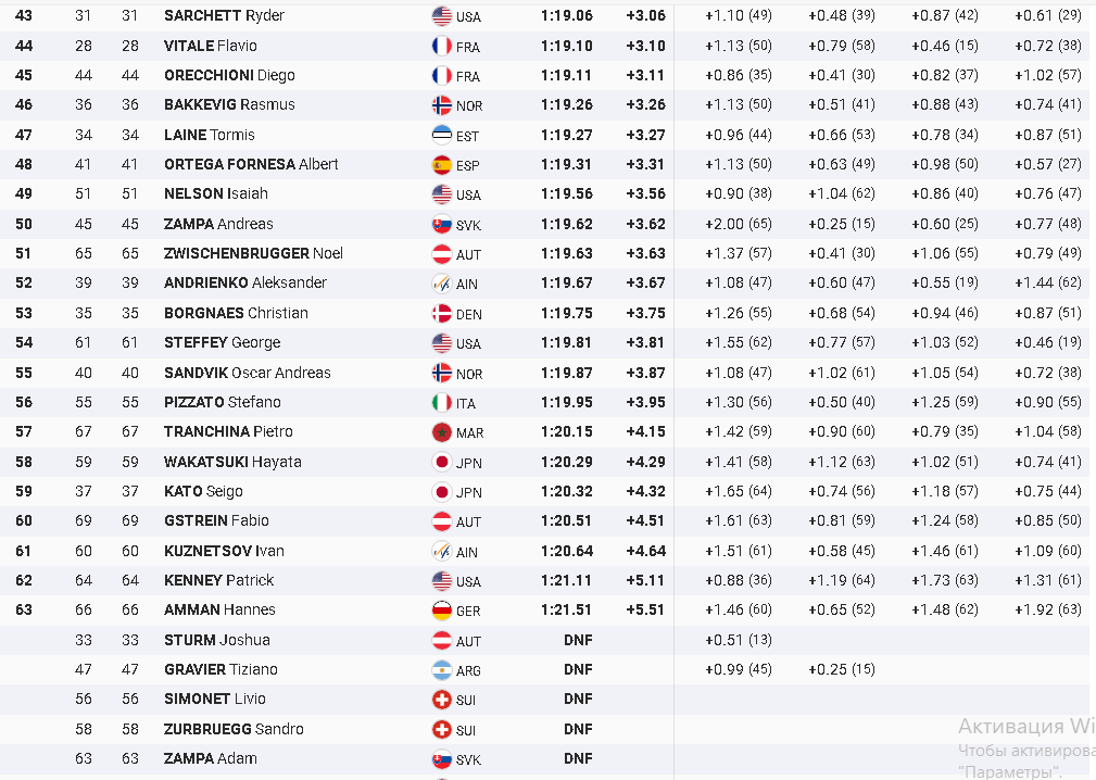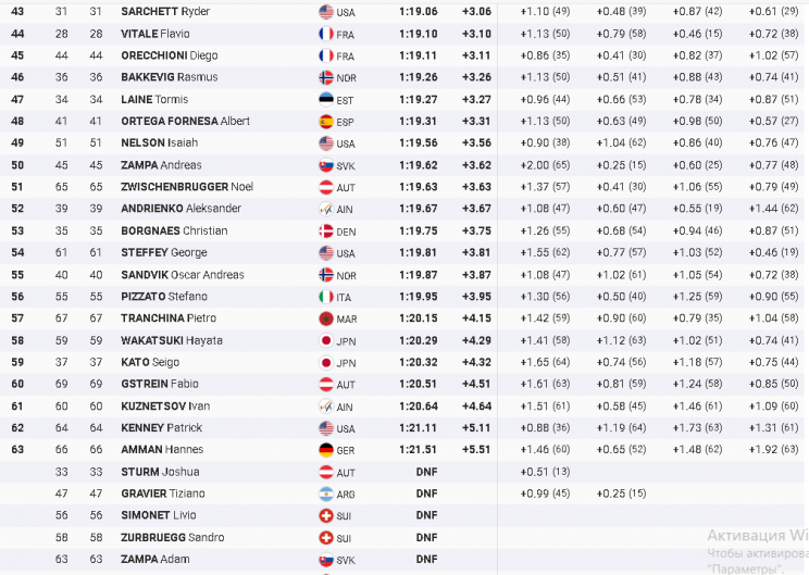 Российские горнолыжники Александр Андриенко и Иван Кузнецов, стартовавшие под 39 и 60 номерами соответственно, в первом заезде финишировали 52 (+3,67) и 61-ым (+4,64).