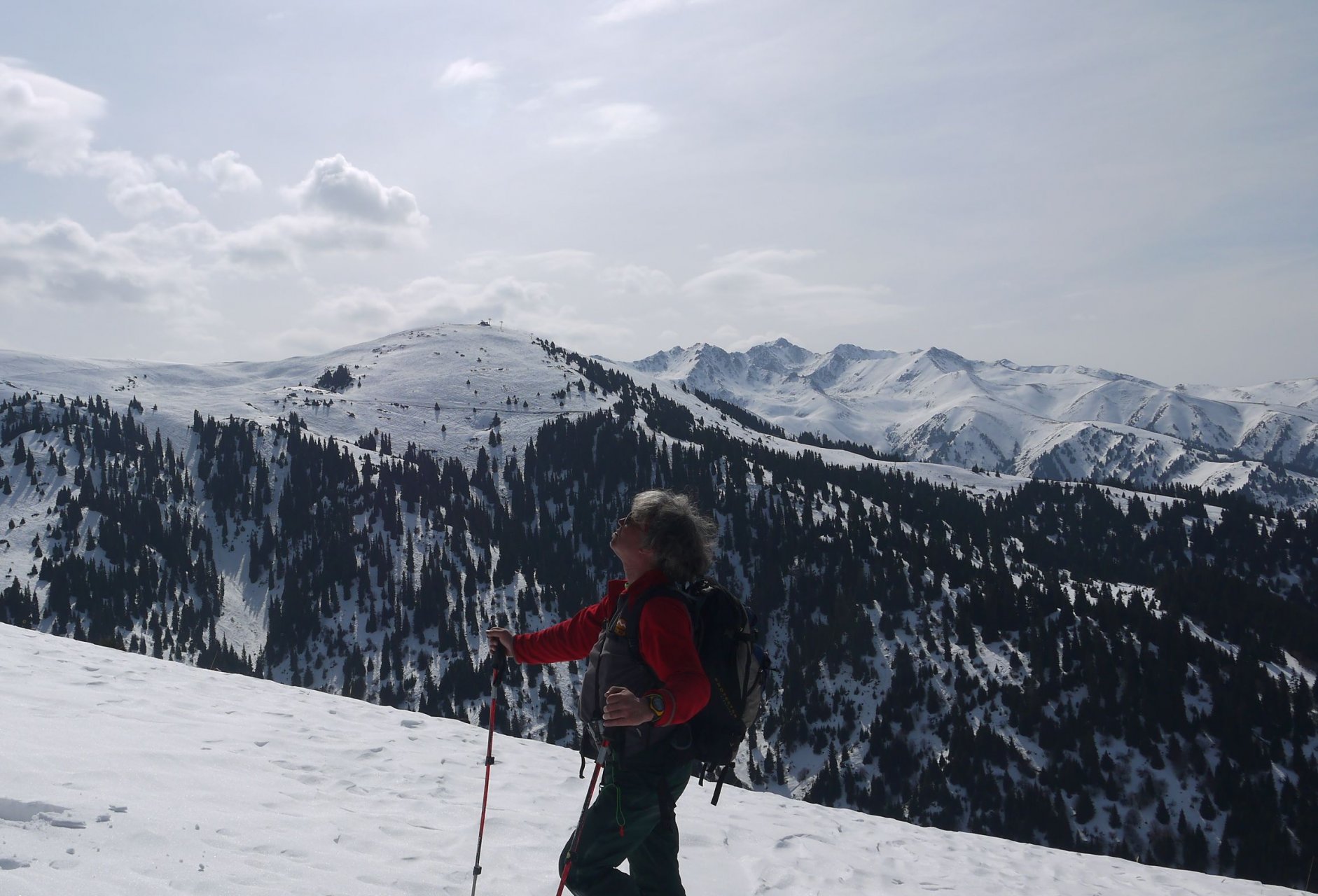 Когда начался густой, плохо проходимый лес и угол подъема стал круче, мы как-то вдруг засомневались в правильности выбранной траектории и взяли курс направо, на южный склон. Огребли вверху небольшой пеший участок по вытаявшему арчовнику. Но зато вышли в соседнюю долину, которая была гораздо круче той, что предполагалась изначально. Не поленились, дошли до самого хребта, полюбовались на бескрайние виды, открывающиеся сверху.