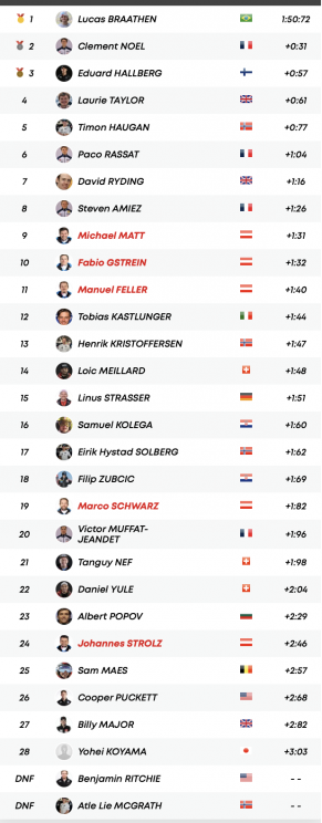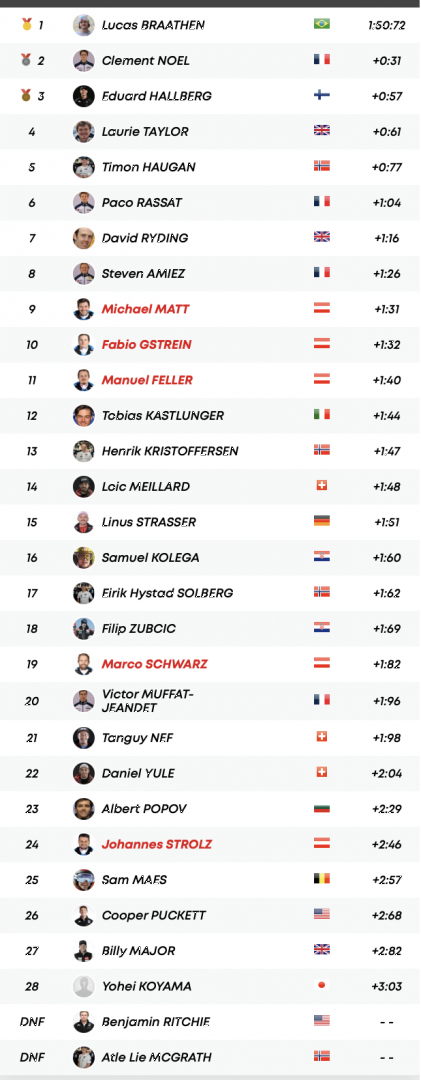 Лучшие австрийцы Майкл Матт (+1,31 сек.), Фабио Гштрайн (+1,32) и Мануэль Феллер (+1,40) финишировали с девятого по одиннадцатое место.
