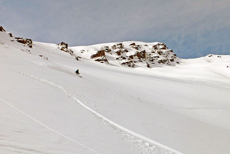 Выше 2500 м, на северной экспозиции и на ледниках отличная целина, которую раскатывают не так быстро, как в Поляне. И на второй день после снегопада можно найти, где оставить свой след.