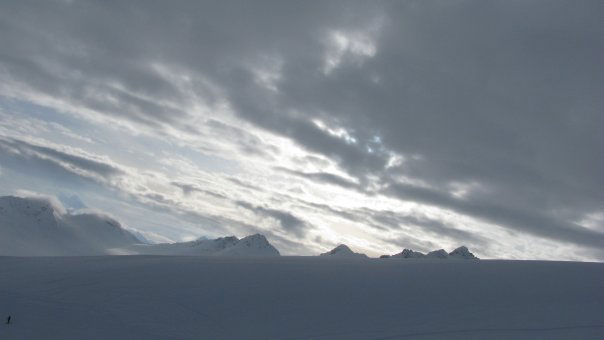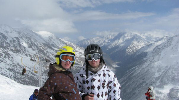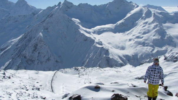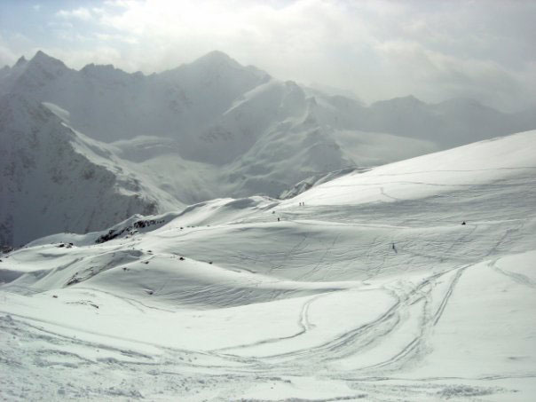 [page]В первый день кататься отправились на Азау (первая станция при подъеме на Эльбрус). Во-первых, нужно акклиматизироваться, а во-вторых, с нами балласт в виде девчонок и начинающего Костика. Немного подпортили настроение подъемники, не работала первая очередь, пришлось воспользоваться услугами ратрака – 400 руб. с человека. Но когда поднялись на третью станцию канатной дороги Кара-Баши, нашему взору открылась панорама Большого Кавказского хребта, вдохновившая не одного поэта. Девчонок и Костика оставили с инструктором, а сами понеслись вниз.
