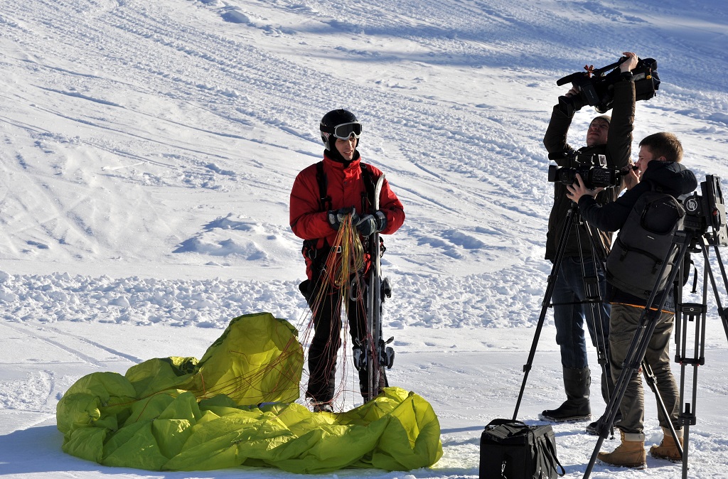 Справка: Спидрайдинг - новый зимний вид спорта, суть которого состоит в скольжении на горных лыжах при помощи небольшого параплана. Связывание полета на планере с лыжами добавляет новые возможности в спуске с горы. Крылья могут достигать скорости свыше 150 км в час.