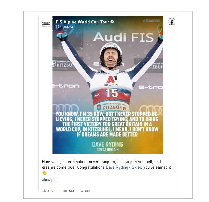 В субботу на трассе Ганслернханг в Китцбюэле прошел классический мужской слалом, который оказался неожиданным. Гонка вошла в историю горнолыжного спорта, потому что победу одержал 35-летний британец Дэйв Райдинг.