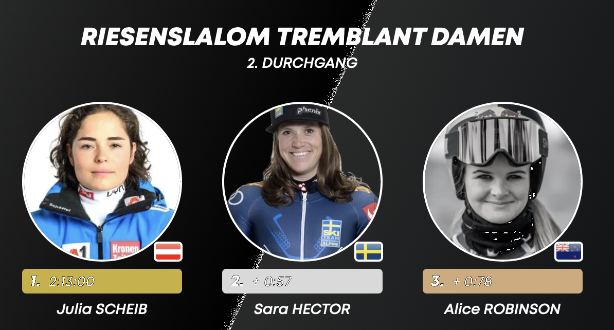Показав лучшее время на второй трассе, Шайб оказала давление на победительницу предыдущего дня. Элис Робинсон (+0,78) из Новой Зеландии, лидировавшая после первого заезда, замкнула подиумную тройку.
