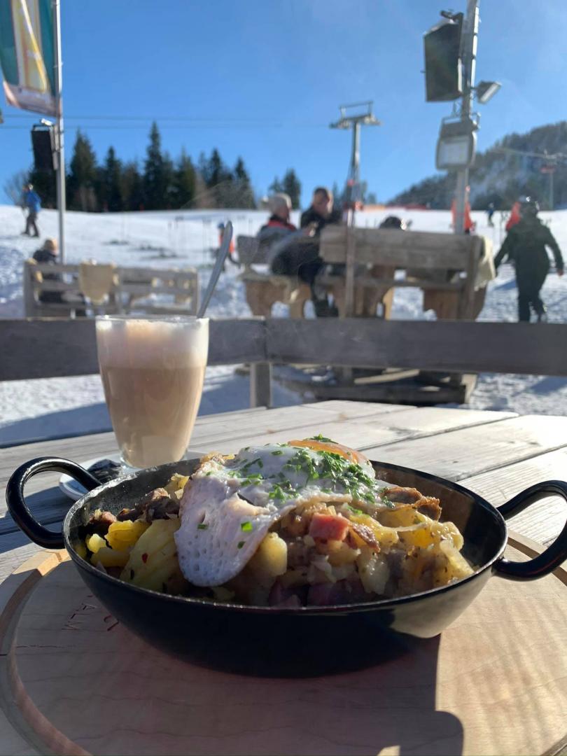 Ведь это не совсем чтобы «еда». Ведь кто-то скажет (и будет вполне даже местами прав), что это не очень-то все и вкусно бывает. Но нет. Это не «еда». Это целая история, это целая поэма. Это про то, как ты катаешься в солнечный день, когда снег блестит, небо синее, горы невероятные. И вот перед тобой Skihütte с симпатичным ресторанчиком. Да и места есть свободные с видом на горы. Ты садишься на овечью шкуру, заказываешь себе тирольскую сковородку с картошечкой, яичницей, колбасками, пиво или вино... и улетаешь. Играет веселая музыка, люди вокруг расслаблены, улыбаются, говорят Prost, друг другу и тебе. Ты ешь эту простую, деревенскую еду, и в сочетании с альпийским воздухом она кажется тебе вкуснее любого мишленовского блюда. Вот эта самая простая картоха с яйцом.