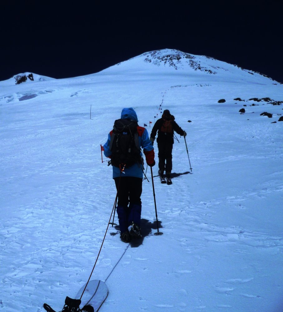 Последствия вчерашних дискуссий сказываются. Видимо, гиды пытаются решить вопрос своими опытом и средствами. Сегодняшний темп не дает даже запыхаться. Идем скитуром, — пешеходы практически не отстают. От места разворота ратрака (низ скал Пастухова, место выгрузки восходителей) склон становится круче и появляется прозрачная ледяная тонкая корка. Будто склон ламинирован. На максимальном угле камуса отказываются держать на серпантине… Понятно, что завтра ночью без кошек будет невозможно скитурить.