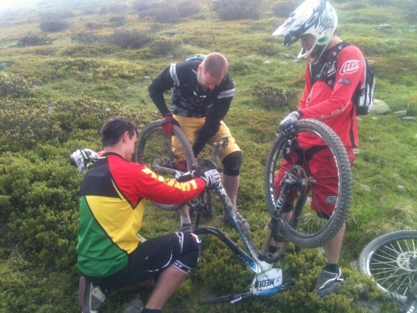 Во время одного из спусков слетела цепь в сторону оси и успокоителя, к счастью как раз в этот момент мимо проезжала русская команда на этом этапе: Миша Василенко, Константин Максимов, Артур Кузин и Азат Шарипов. С помощью снятого шатуна проблема была решена и я поехал дальше (правда цепь продолжала слетать, так как успокоитель окончательно развалился). Спасибо ребята!!!