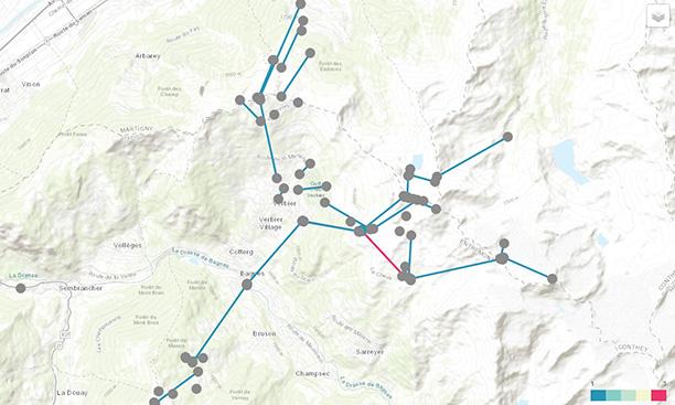 Рис. 2. Серые точки обозначают здания в зоне катания Verbier, потребление энергии (отопление, горячая вода, электричество) которое регистрируется платформой OBSERV. Данные о потребляемой мощности фиксируются интеллектуальными счетчиками каждые 15 минут. Красные и синие линии визуализируют лыжные трассы, загрузка которых может отображаться в режиме реального времени.