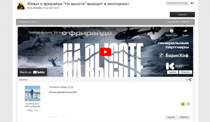 Это первый лыжный и сноуборд фильм, который выходит в прокат в РФ, это очень круто, и говорит о многом. Приглашаем всех собраться вместе, погрузиться в атмосферу гор, почувствовать дух фрирайда, и насладиться красивым фильмом! 📽🔥