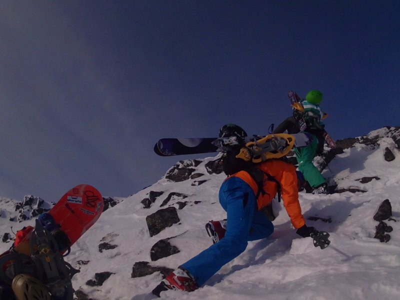 Ну и как же без каталки? Перед занятиями устраиваем небольшое восхождение и спуск по «Городской щели». Наверху порывы ветра такой силы (до 20 м/с), что могут запросто уронить сноубордера с доской за спиной: приходится нагибаться, а то и вообще вставать на колени. Patagonia style))). В щель уже накидало немного снега — ехать одно удовольствие. Удовольствие настолько большое, что, не задумываясь, идем на второй заход. В верхней части кулуара есть небольшая скальная «пробка», где получился отличный трехметровый дроп. Первый такой большой в моей жизни.