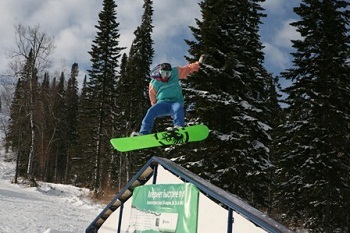 Вдоль линии бугельного подъемника расположилась джибб линия сноупарка. Здесь, на фигурах, изготовленных специально к открытию, свое мастерство демонстрировали ньюскуллеры и сноубордисты.