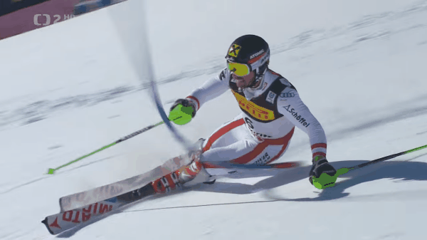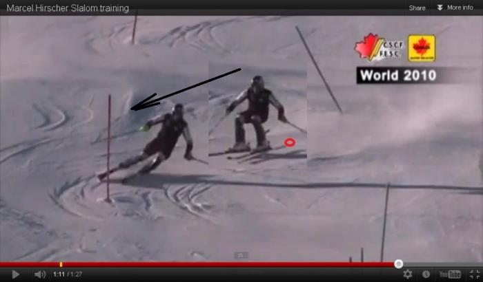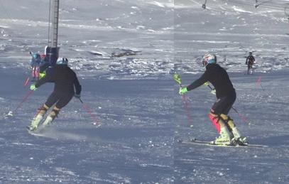 Лыжник подает таз НАПРАВО и этим интенсифицирует поворот ЛЫЖ НАПРАВО. Если лыжник РЕЗКО подаст свой таз направо, то лыжи РЕЗКО вкрутятся в правый поворот. То есть,лыжник может регулировать интенсивность этого "вкручивания" лыж в поворот мышцами своего кора.
