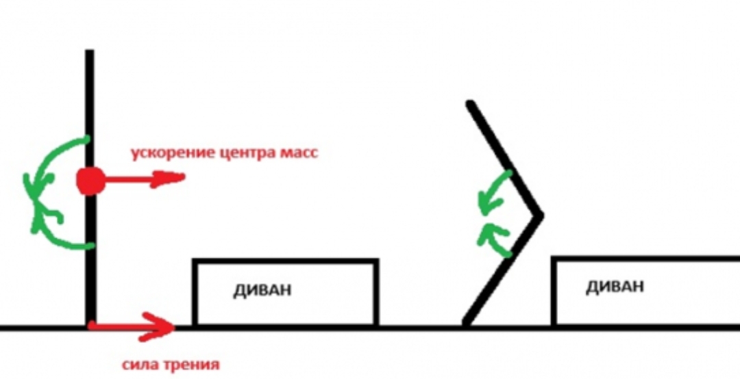 Человек использует мышцы кора для УСКОРЕННГО (с усилием!) сгибания тела. Мышцы кора тянут «верх и низ» в направлении зеленых стрелок. Верху ничего не мешает двигаться. НО сила трения препятствует движению ног. Схематически это выглядит примерно так: