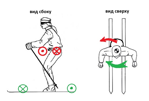 По закону сохранения импульса лыжи начинают вращаться в противоположном направлении (зеленая стрелка) и при этом встают на правые канты. При медленом движении лыж начинается поворот направо как за счет постановки лыж на канты и загрузки носов лыж, так и за счет "вкручивания" лыж в правый поворот путем создания некоторого угла руления или скольжения ( так угол между продольной оси лыжи и вектором скорости центра лыжи называют в профильной литературе).