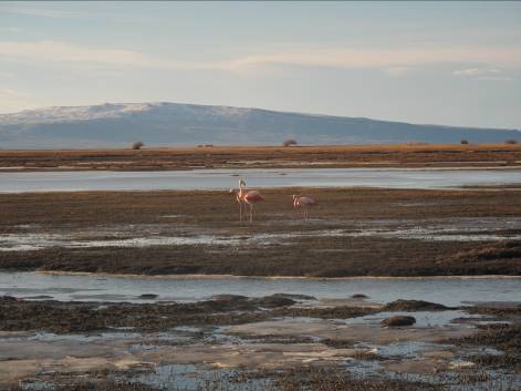 Дошли до набережной Lago Argentino. Озеро затянуто льдом, прямо в 100 м от набережной по озеру разгуливают удивительной красоты розовые фламинго!