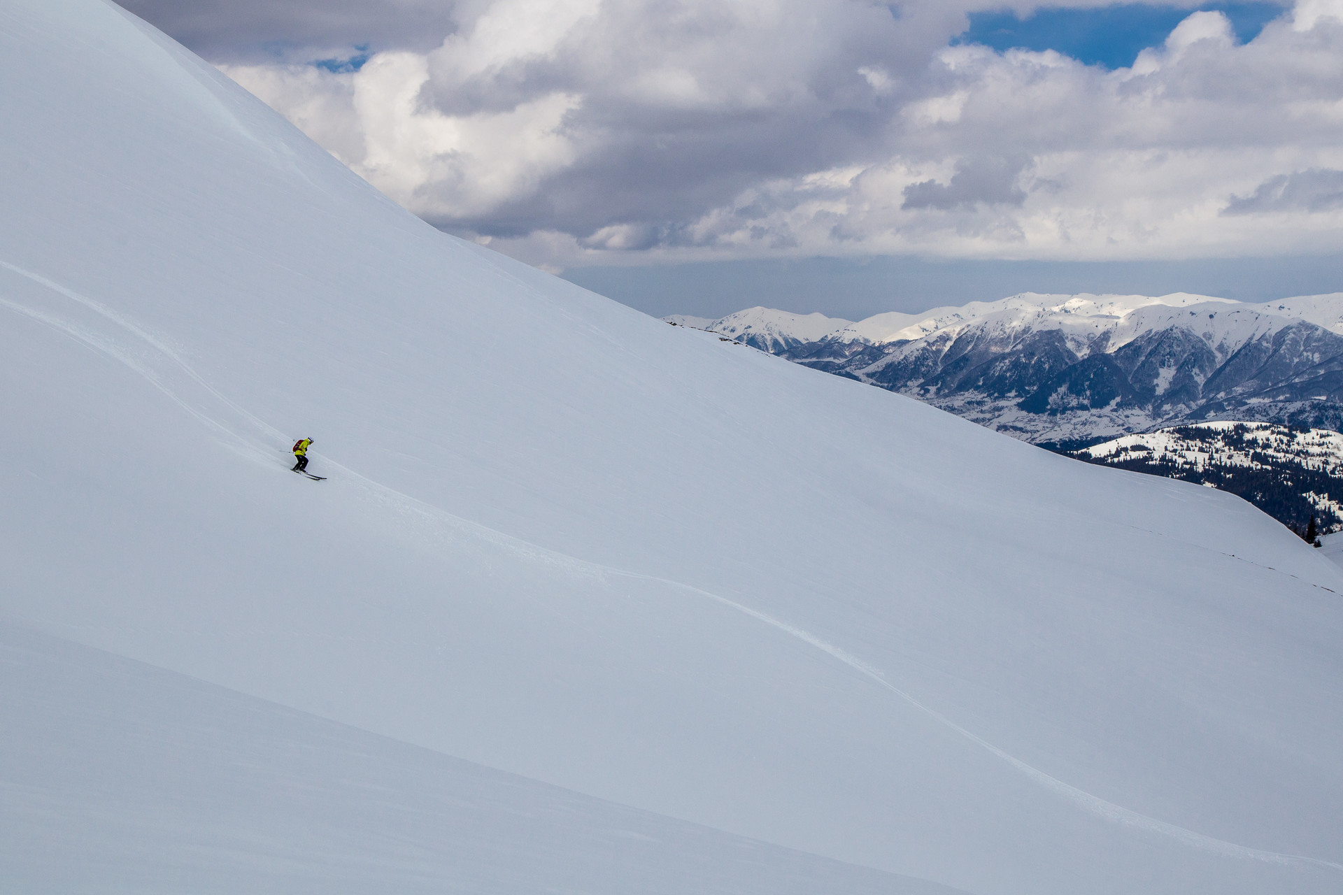 Но опытный взгляд вкупе с внимательным изучением дневного прогноза и карты склонов, позволяет отыскать целинные полянки в непосредственной близости от подъемников.