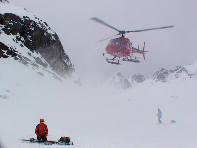 Сегодня полетов не будет, облака практически лежат на воде. Гиды устраивают брифинг и демонстрацию снаряжения. Каждый получает рюкзачок с ABS, бипер, лавинный щуп, лопату, страховочную беседку и рацию. Инструктаж, равно как и все общение с гидами, на английском. Назначается время принятия решения о полетах - 10 утра. Теперь все зависит от погоды. Надо на всякий случай отоспаться. Разница во времени с Сибирью 9 часов. Утро двусмысленно облачное, но гиды говорят, что летим. Завтракаем на совесть, каталка предполагается без пауз, несмотря на то, что одна вертушка будет поднимать три группы по 4 человека. Первая группа летит на место катания на вертолете, две последующие, на катере. Облачность такая, что полеты могут завершиться в любой момент. Спуски соответственно короткие, снега маловато, под 15-20 сантиметрами свежего снега жесткий наст либо ледник. День начинается весело, Николя "удачно" поправляет чеку и у него срабатывает AIR BAG, а я наверху первой заброски с удивлением понимаю, что попутал левое и правое крепления. Как говорится, и на старуху бывает проруха... не при бабушках будет сказано;)