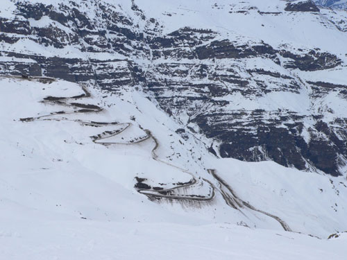 После проезда шлагбаума дорога начинает подъем в гору по серпантину с приличными отвесами по бокам. Ограждения практически отсутствуют, зато присутствуют венки и памятники. Примерно через тридцать поворотов есть знаки поворотов с порядковыми номерами, развилка направо – Валье Невадо, налево – Форелонес, далее Эль Колорадо и Ля Парва.
