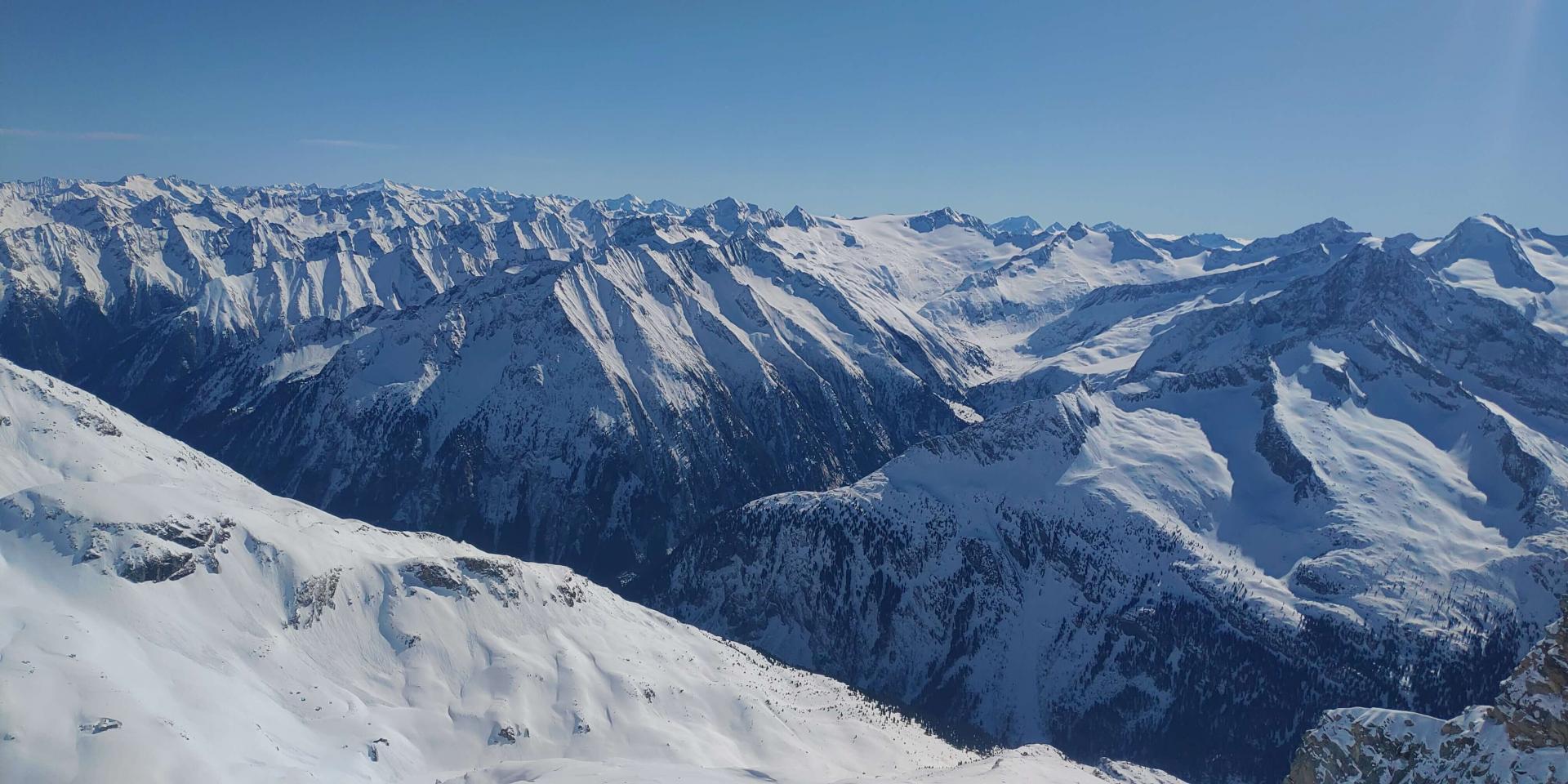 А фон сегодня был невероятно красив. С самой высокой точки ледника прекрасно просматривались все вершины вокруг вплоть до Цугшпитце (где, кстати, сегодня ограничили количество посетителей), виднелась долина Иннталь и во всей красе внизу распростерся сам Циллерталь.