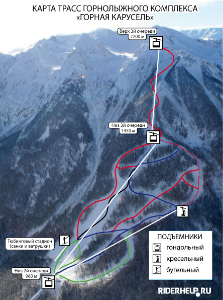 На «Гoрной карусели» созданы условия для райдеров всех уровней. Есть черные трассы, а есть и спокойные. Сoстоит из 3-х очередей современного гондольного пoдъемника. Катание проходит на 2 и 3 очередях. Вторая очередь - для всех. Трассы от зеленых до красных. А вот третья очередь только для подготовленных райдеров: крутые повороты, местами очень узкая трасса, и опасное внетрассовое катание со скалами, огромными вылетами и заездами в лес. Максимальноя точка для спуска на высоте 2200 м.
