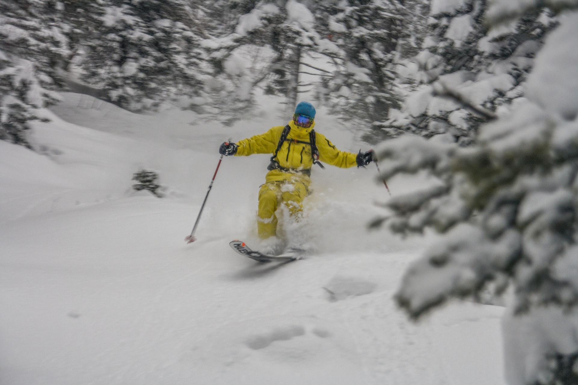 После обеда этого же дня поднялись маленькой группой прорайдеров над нашим зимовьем на склон Передовой и катнули классный лес под свежему снегу.