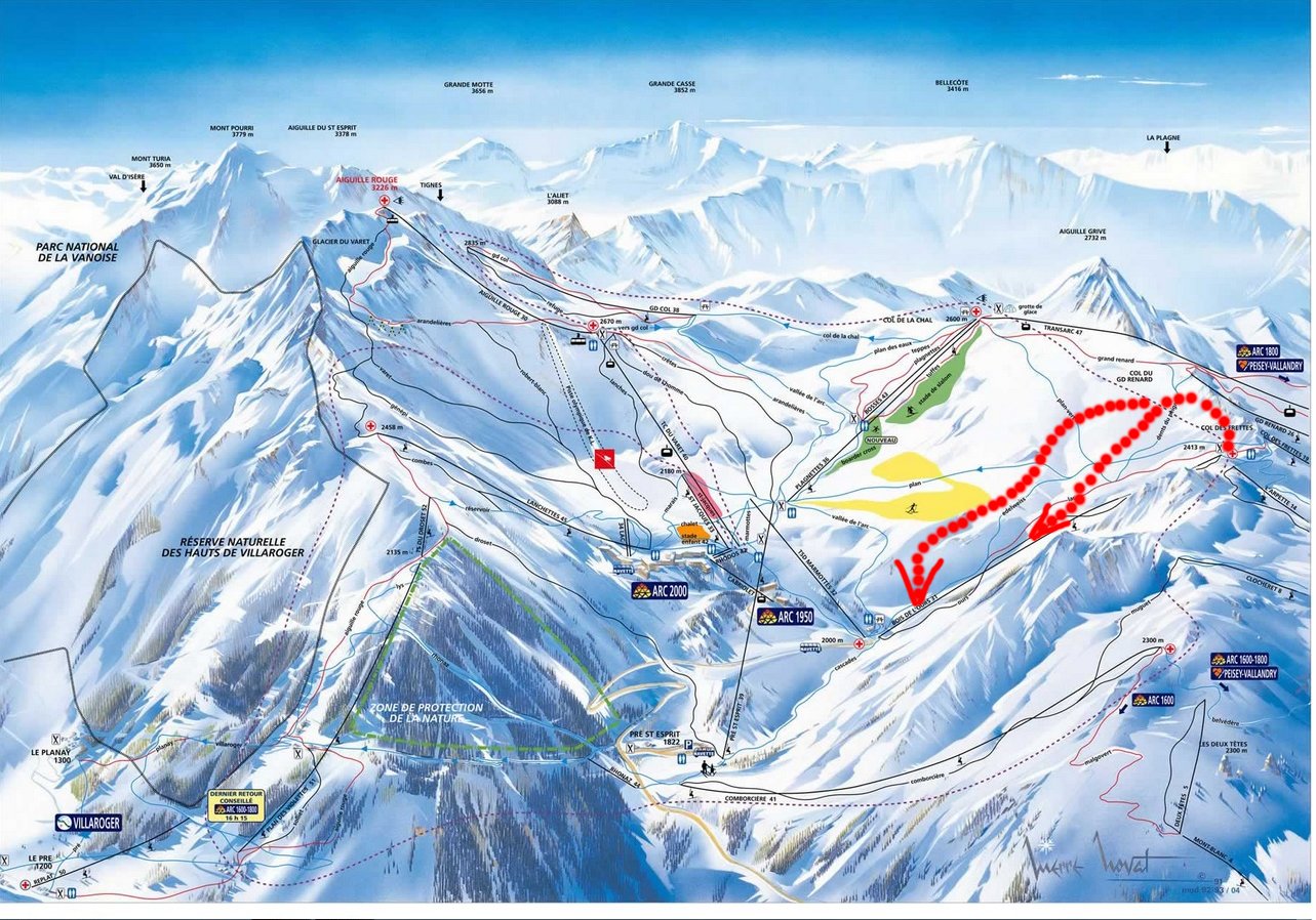Отдельная тема – внетрассовые Парадиски. Но мой личный опыт в этом направлении –не велик, да и выбираться в Арках за трассы почти всегда приходилось одному, но могу порекомендовать несколько достаточно доступных и не особо сложных маршрутов,для желающих попробовать себя вне трасс. Для выхода за пределы трасс вполне подойдет уход за сетку, с гребня на трассе Grand Renard, на который собственно забрасывает магистральный подъемник Transarc2, непосредственно из Arc1800.