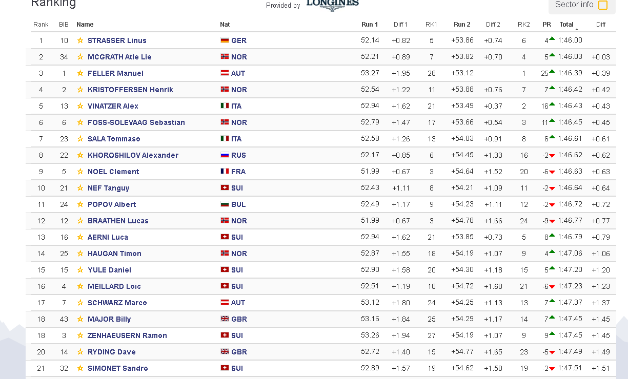 Соотечественнику МакГрата Хенрику Кристофферсену (+0,42) не хватило до подиума всего 0,03 сек. В 0,01 сек. от Хенрика на пятом месте - молодой южнотиролец Алекс Винатцер (+0,43). Еще в 0,02 сек - норвежец Себастьян Фосс-Солеваг (+0,45) , действующий чемпион мира по слалому, он финишировал шестым.