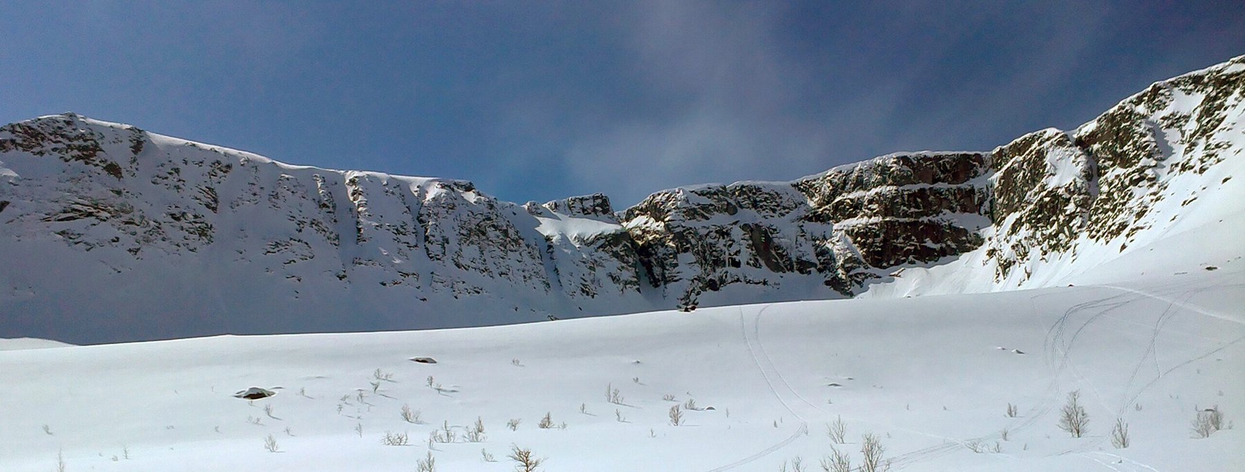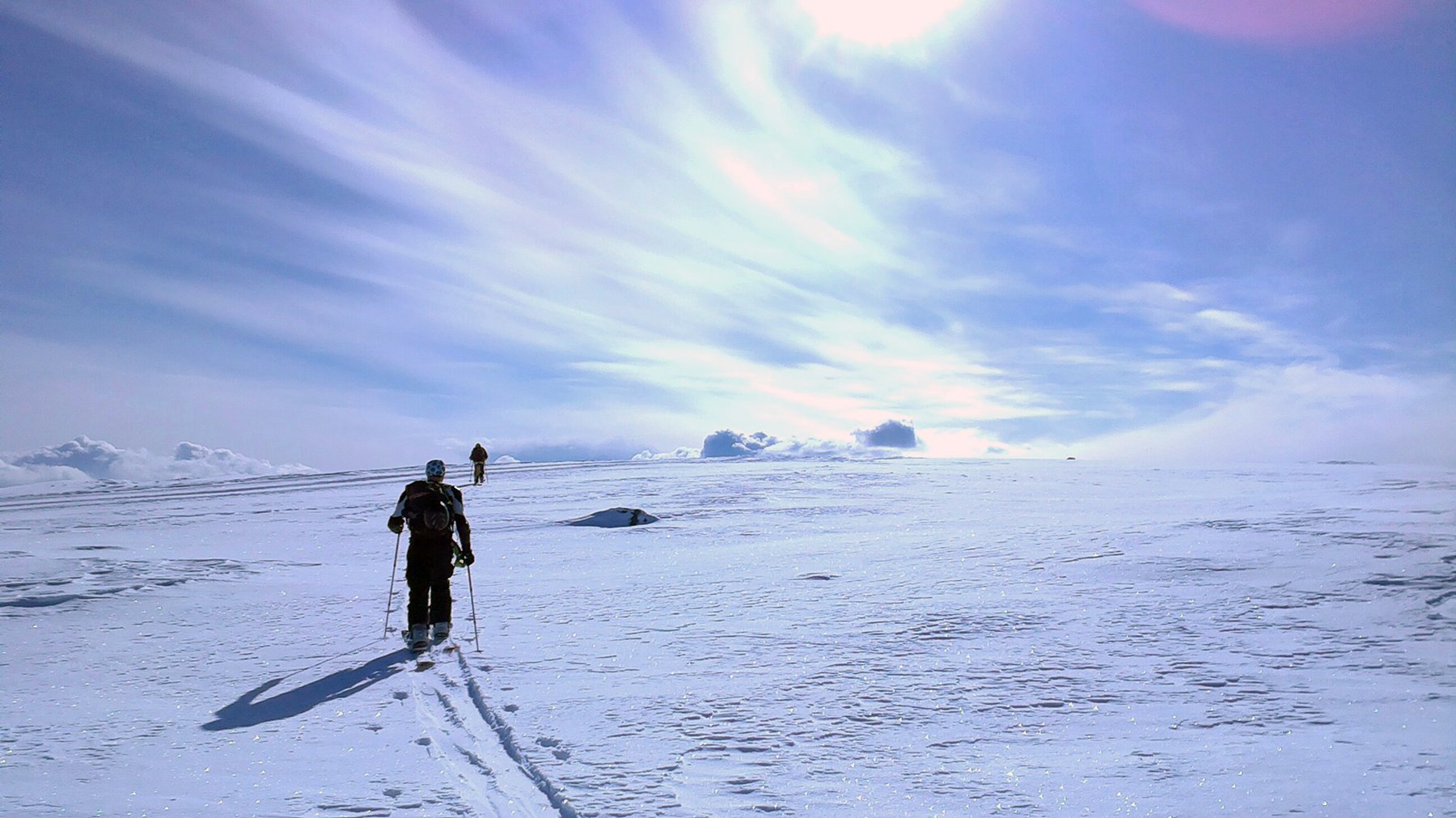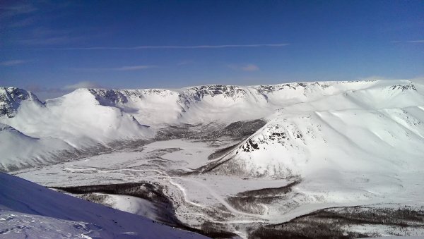 Так как продолжалось знакомство со ски-туром для страждущих, задумали выход на Вудъявчорр для проката очевидных и не слишком сложных линий. На самом старте мнения разделились и Куба с сотоварищами пошел штурмовать его через цирк, где подъем был короче, но круче и на южной экспозиции. Мы же решили сделать круговой заход, так как там был пологий и удобный заход и потенциально неплохие поля. В целом надежды оправдались – на самый верх даже начинающие забегали очень бодро, а оценив снег и поля, по которым шли, решили не идти в южные цирки – катнули прямо там, причем пару раз.
