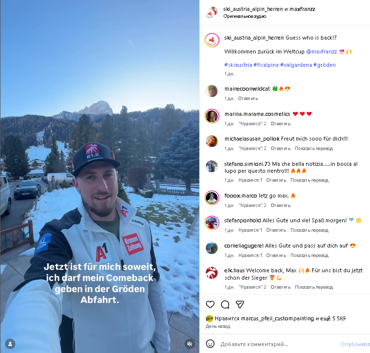 36-летний австриец впервые с 16 марта 2022 года стартовал вчера на втором спуске в Валь-Гардене. Франц сам анонсировал свой comeback в Instagram.