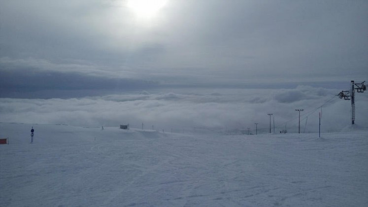 Сказать, что на склоне ничего не видно, конечно нельзя. На расстоянии метров 5-10 видны очень яркие плакаты с надписью "Склон закрыт, лавинная опасность", немного видны люди в яркой одежде и... и, пожалуй, все. Вокруг абсолютно белая пелена - "молоко" и периодами даже невозможно определить крутизну склона, так как непонятно где заканчивается граница снега и начинается граница неба. Конечно, если вы приехали кататься, а не по сторонам смотреть, то вопросы видимости не должны вас пугать, поскольку вы приехали за ощущениями езды, а не за пейзажами вокруг вас.