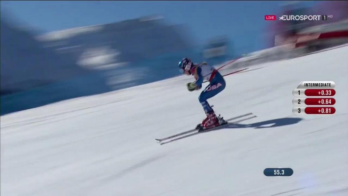 Первое, что, как я видел, она постоянно делала в ходе этой гонке. Посмотрите на носки и пятки ее лыж. На траекторию носков и траекторию пяток. Пятки едут по более длинному пути, чем носки в большинстве поворотов. Выглядит, как будто она выталкивает лыжи, сбрасывает пятки, чтобы поставить лыжи на кант. Также можно увидеть фонтаны снега из-под лыж. Но я должен сказать, что техника Микаэлы определенно лучше, чем у остальных девушек, хотя в данный момент она не приводит к быстрейшему прохождению трассы. Одна из причин, как мне кажется, в не оптимальной регулировке ботинок, что влияет на инициацию поворота.