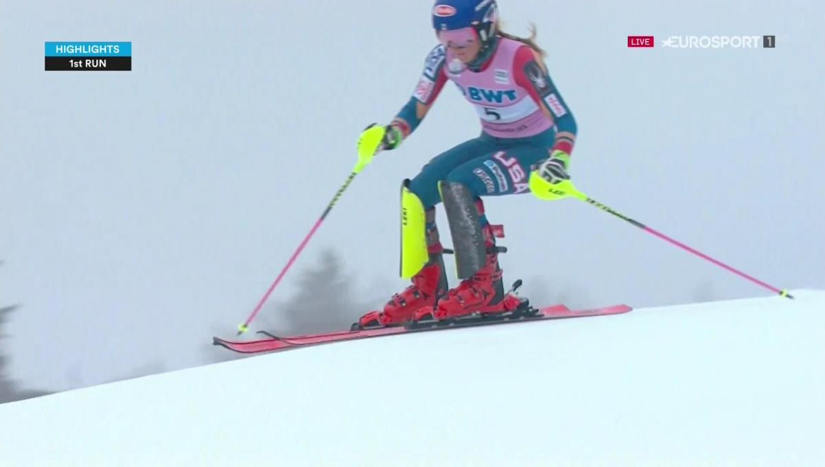 Здесь опять плечи уходят назад. Все то же самое. И с руками тоже не совсем все хорошо, она ими несколько беспорядочно размахивает. У Микаэлы же с дисциплиной плеч, рук и бедер все намного лучше. Но Виктория больше атакует в верхней части поворота, врезает канты и карвит большую часть поворота. Это то, чего не хватает Микаэле, и что она могла бы изменить, чтобы побеждать.