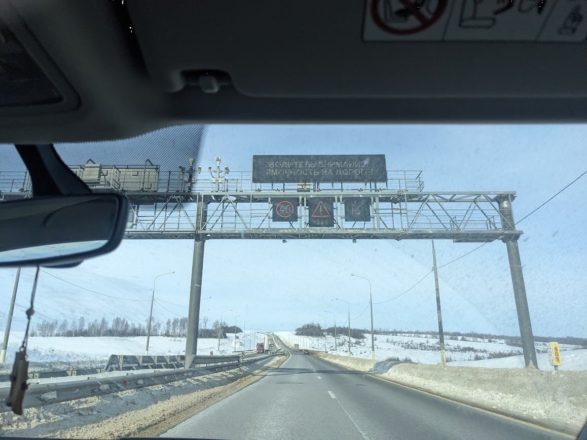Однако, дорогу, по которой я давно уже не ездил, я себе совсем другой представлял. Платная магистраль, с ограничением 110 км/ч (не везде), яма на яме! Дорожники даже предупреждения вывесили на электронных табло. Слово-то какое придумали!