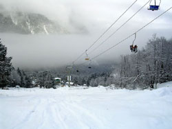 Очередей не было. В самые праздники в разгар катания на двухкреселке можно было простоять от силы минут 10, на однокреселке же половина кресел ехала пустая. Отсутствие очередей объясняется ограниченным количеством мест в гостиницах и на турбазах. Поэтому люди бронировали места в Цее сильно загодя. Например, там была компания роллеров из Москвы, человек пятьдесят, так вот они заказывали места еще в августе. Большой контингент катающихся состовляли местные из Владикавказа, но и их было явно недостаточно для создания полновесной очереди. Кстати, мне очень понравились владикавказцы: общительные, открытые, ненавязчивые. Понравилось, как их молодые люди относятся к девушкам. Девушки демонстрировали наивность и беспомощность, молодые люди по-рыцарски их опекали. Еще привлекало внимание люди на телемарках, их было человек шесть. Было любопытно с канатки наблюдать их необычные «коленопреклоненные» движения на лыжах.