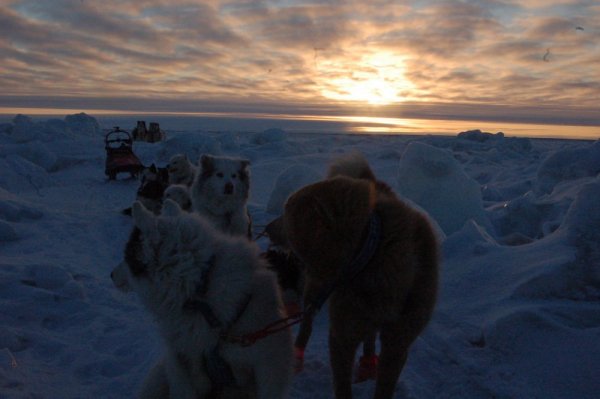 Вскоре вдалеке появилось черное пятно, которое по мере приближения материализовалась в наш снегоход с двумя грузовыми нартами. Рядом со снегоходом шипел примус и бодрый чайник выдавал веселую музычку закипающей воды. Тут же, на чайнике, отогревалась буханка мерзлого хлеба. Из под капота, из специально вмонтированного ящика, достали банку теплой тушенки. Разложили юколу и немного шоколада. Подошла и вторая упряжка. Собаки дружно, без лишнего шума-гама, улеглись в снег. Особо ретивый кобель моей упряжки — Чебурек, тут же уснул. Завалившись на кухлянки, разлили чаи и погрызли хлеб, черпая ложками теплую тушенку.