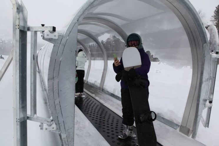Канатная дорога протяженностью 250 метров рассчитана на детей и новичков, которые еще не чувствуют себя уверенно. Время подъема траволатора — 3,5 минуты.