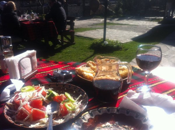 Кормят в Болгарии очень вкусно, цены приемлемые — на горе в кафешке есть салаты, супы, второе, гарнир, все как в горнолыжной Австрии. Но дешевле, обед на взрослого обойдется в 400-600 рублей в зависимости от выбранного блюда, эта цена включает в себя напиток (алкогольный или нет, это ваш выбор)