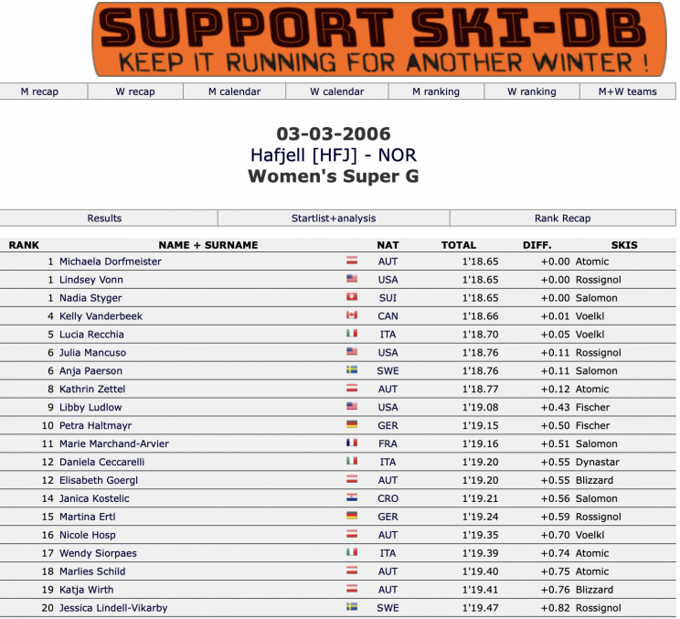 Аналогичная история повторилась 3,5 года спустя - на трассе Super-G в норвежском Хафьелле. Норвежка Надя Стигер, американка Линдси Вонн и Микаэла Дорфмейстер из Австрии поделили 1-е место. А Келли Вандербек, занявшая четвертое место, уступила троице всего одну сотую.