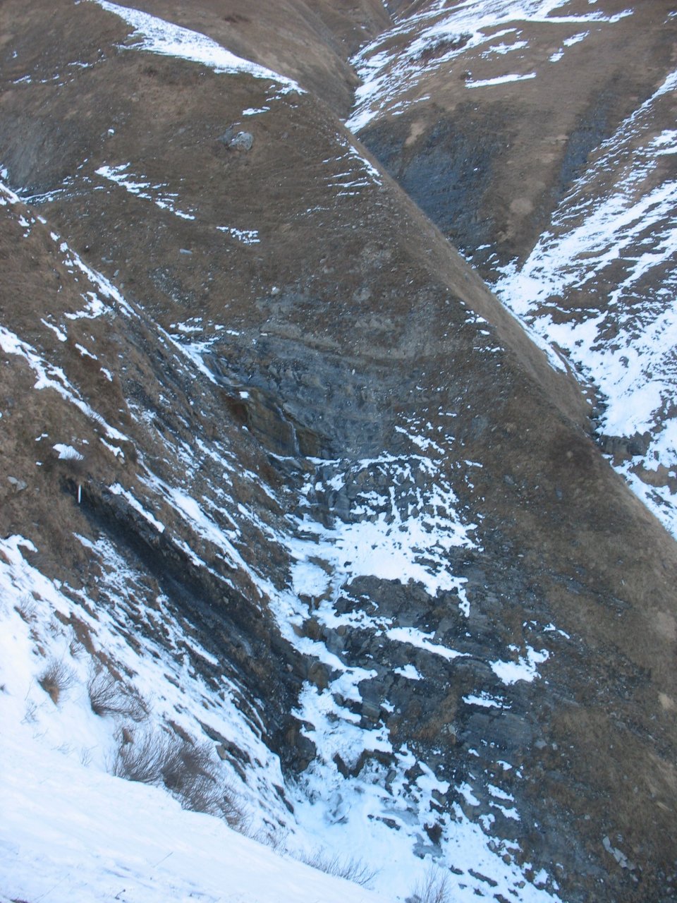 В снежное время хороший, крутой и даже страшноватый своими карнизами спуск с Бидары был чуть южнее нашей горки, но склон там другой ориентации, посему он нас не дождался и вытаял. Школы водили своих к Бидаре со стороны канаток. Но спускаться им приходилось далеко не сверху, а вот так…