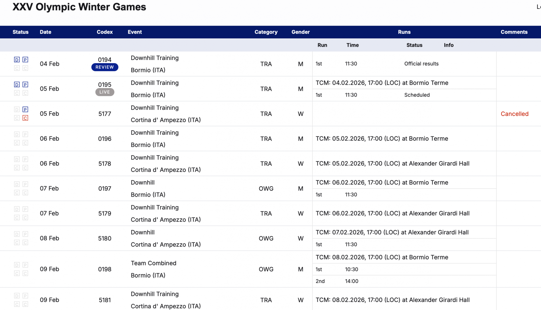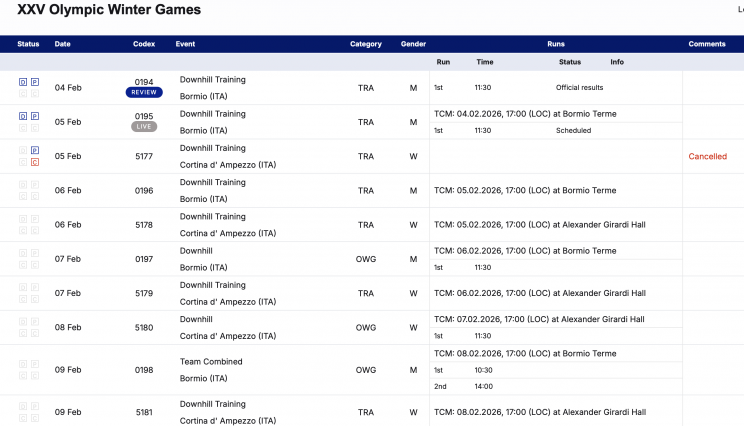 Первая официальная тренировка скоростного спуска у женщин на зимних Олимпийских играх на трассе Тофане в Кортина-д'Ампеццо должна была пройти в четверг и отменена из-за постоянного снегопада и плохих прогнозов.
