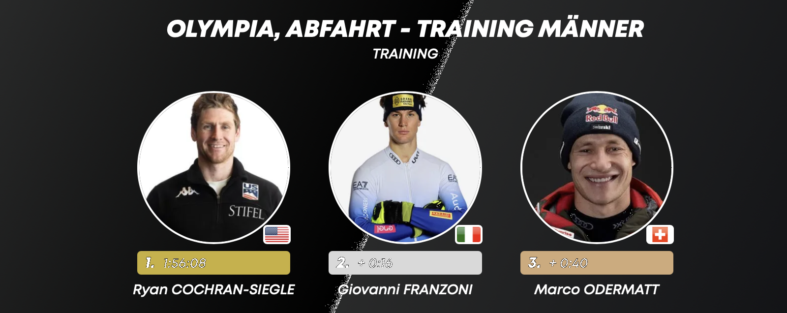 Самым быстрым неожиданно оказался Райан Кокран-Зигл из США, за ним итальянец Джованни Францони (+0,16), третий и четвертый - швейцарцы Марко Одерматт (+0,40) и Алексис Монни (+0,66).