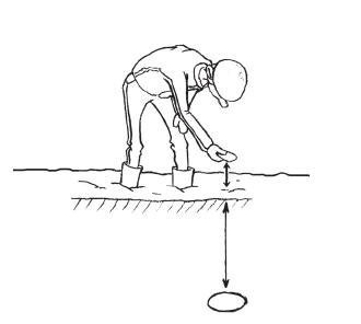 Датчик при точном поиске держат как можно ближе к поверхности снега. Цель поиска на этом этапе — обнаружить область наиболее сильного сигнала. На протяжении завершающих 3-5 м поиска датчик очень медленно перемещают над поверхностью снега. При обнаружении области наиболее сильного сигнала (наименьшего показателя индикатора расстояния) эта точка маркируется и начинается зондирование данной области. Менее совершенные одно-, двухантенные и аналоговые датчики при точном поиске могут показывать несколько точек максимума сигнала (минимума расстояния). Это происходит потому, что в этом месте принимающая антенна датчика оказывается сориентирована перпендикулярно или под углом к вектору напряженности электромагнитного поля, излучаемого искомым датчиком.![]()