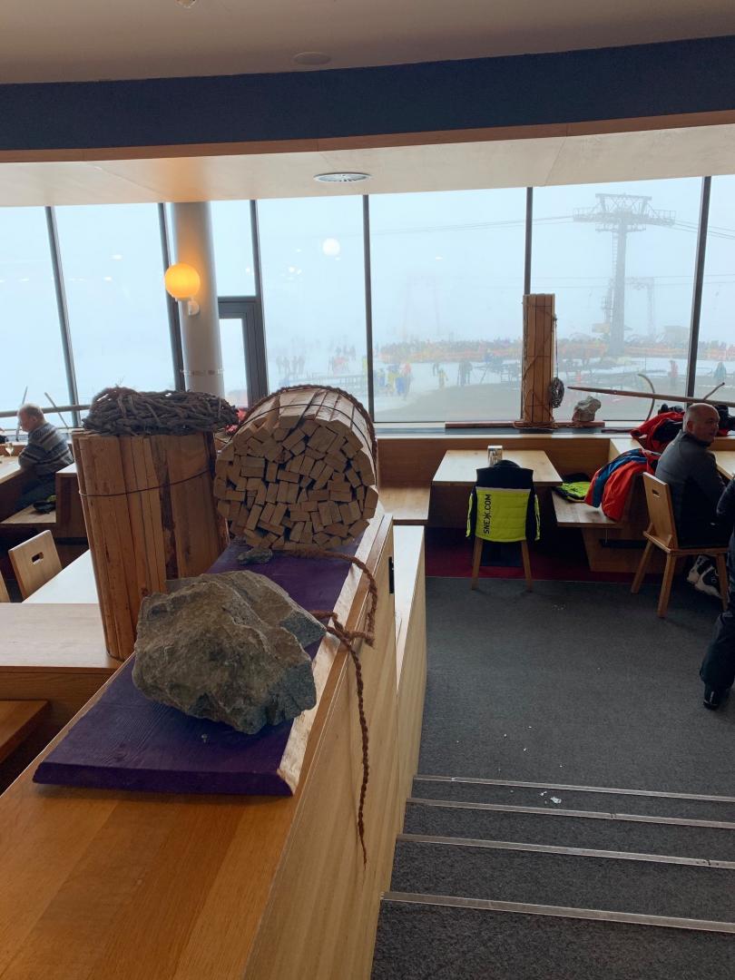 На третий день с девизом "в хорошую погоду каждый дурак кататься может" я спустилась аж два раза. Работал только подъемник Eisgrat и то не до самого верха. А наверху запустили только один бугель. Ветер был такой силы, что мои 50 кг веса наверху слегка сносило вдоль склона. Детей просто сносило на фиг. Поднимаясь на бугеле наверх в голове вертелось что-то не цензурное про "ветер в харю...", но я девочка приличная и вслух это не скажу. После второго спуска к ветру и снегу добавилось непроглядное "молоко", окончательно убедив меня, что самое классное место на леднике сейчас в тепле ресторана.