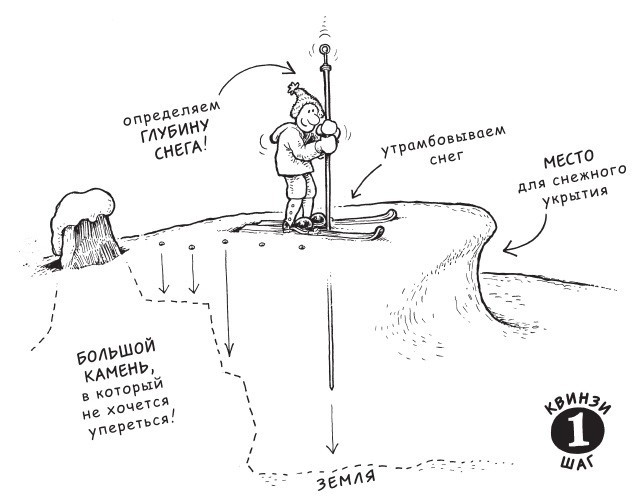 Не забывайте копать вверх, чтобы над головой не оставалось слишком много снега (более 60 см), и в случае обрушения квинзи не похоронило вас под своими обломками. Будет очень хорошо, если снаружи всегда будет стоять человек, который не только занимается отбрасыванием снега, но и придет вам на помощь в случае обрушения. Особо мнительные «кроты» надевают лавинные датчики.