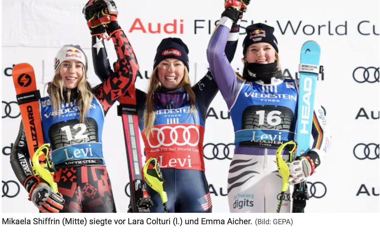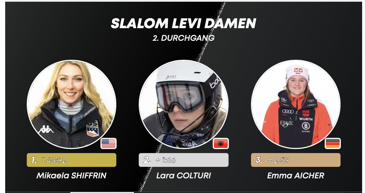 В субботу Микаэла Шиффрин уверенно выиграла первый слалом Кубка мира и в девятый раз одержала победу в Леви. Вместе с ней на подиум поднялись Лара Колтури (+1,66 сек.), итальянка, выступающая за Албанию, отметившая 15 ноября 19-летие, и немка Эмма Айхер (+2,59), которой 13 ноября исполнилось 22 года.