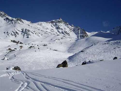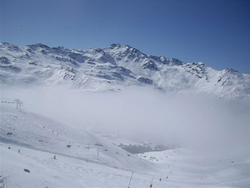 Спортсмены уехали с утра в Тинь. У нас по плану была следующая долина - Валь Торанс (2300м). Пять подъемников... и мы на месте. Поднялись в большом вагоне на Crime de Caron. Ушли влево, здесь много всяких вариантов спуска к Валь Торанс. Следы практически уже везде были, выбирали места, где их поменьше. Да, неплохо, но не поросячий визг. Длинный спуск, распаханный внизу. Оговорюсь, что более лучшего не нашли, и заключительный (пятый) спуск проехали чуть ближе к опорам.
