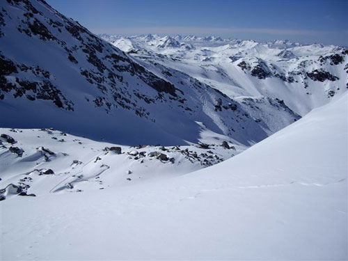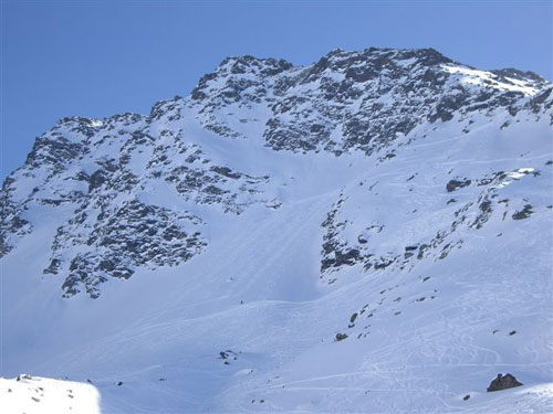 Опять поднявшись в вагонах, спустились на другую сторону хребта в долину Orelle. Вроде, и склон неплохой, но вязкий снег. Горы какие-то покатые, кулуарчиков ярко выраженных нет, а камней навалом. Солнце хорошо поработало, и на южные склоны больше не тянуло. Поднялись на Bouchet, с него 15 минут пешком шли до гребня и в кулуар. Нижняя часть - выкат на трассу бордеркроса, веселуха! Подъемник назад один - Rosael. С него - прямо в ярко выраженный кулуар (на правой стороне снег был мягче, на левой - жесть).
